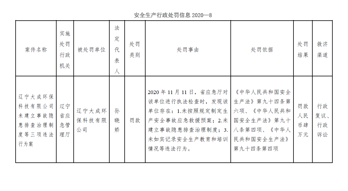 安全生产行政处罚信息2020-8