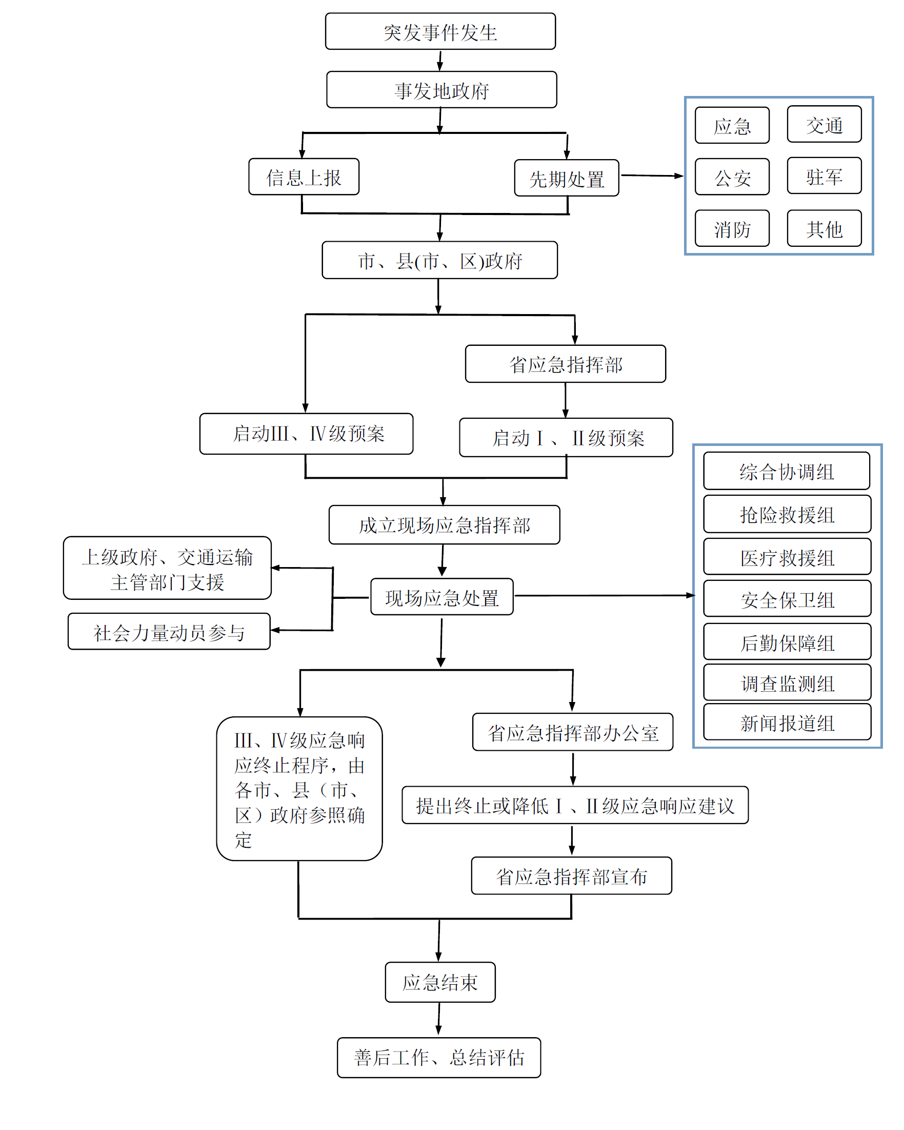 发生符合本预案事件分级中所规定的特别重大(Ⅰ级)、重大(Ⅱ级)公路水路突发事件时,由省应急指挥部启动Ⅰ级、Ⅱ级应急响应,具体处置程序详见应急处置流程图。